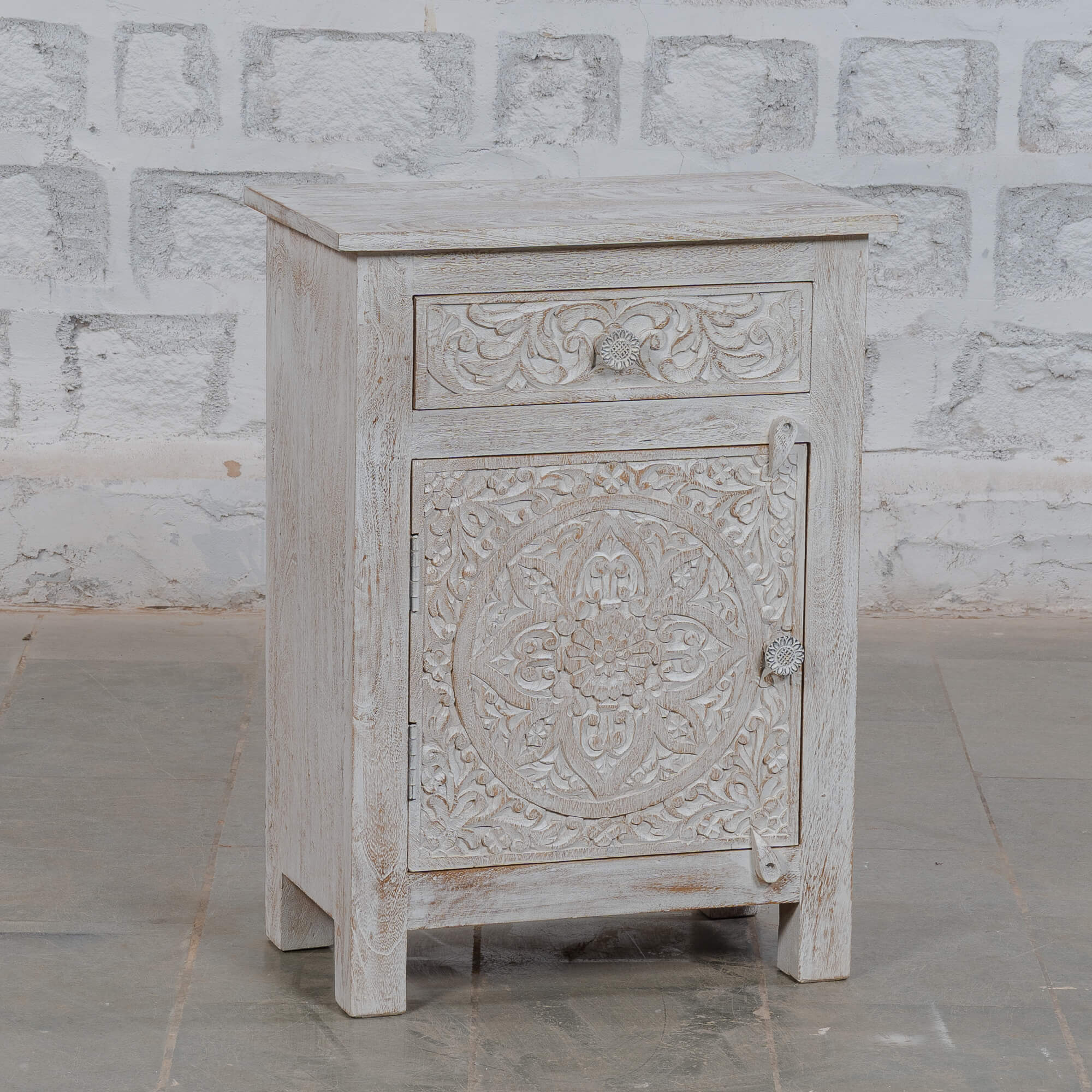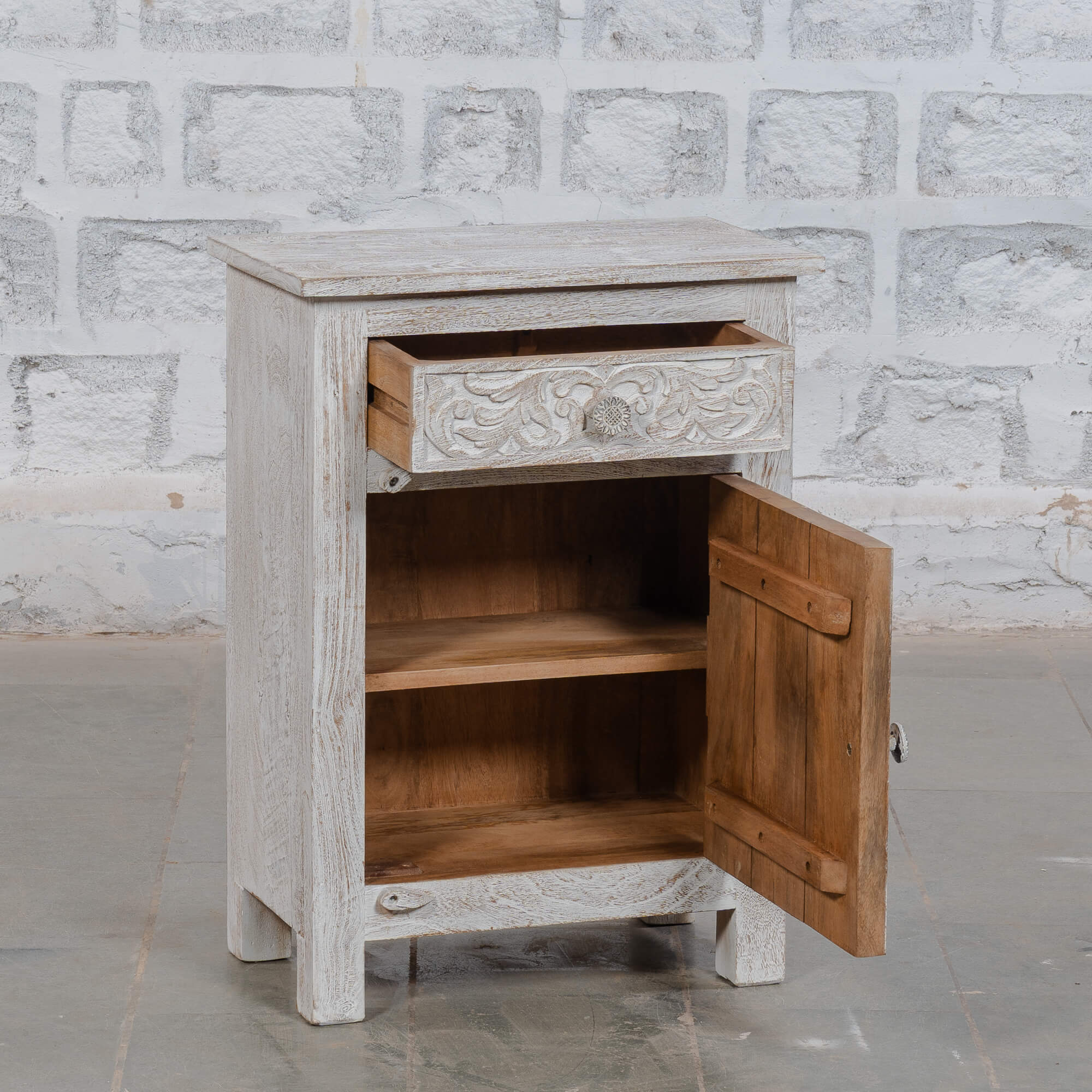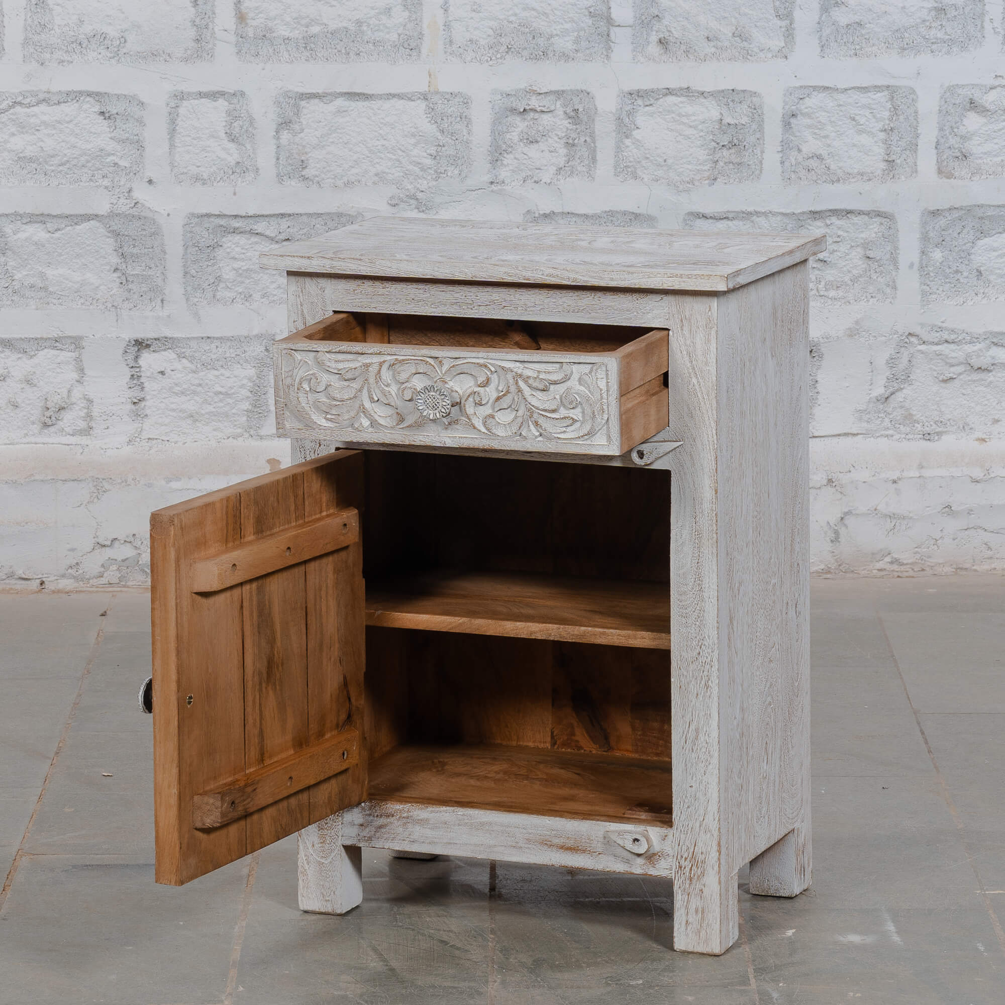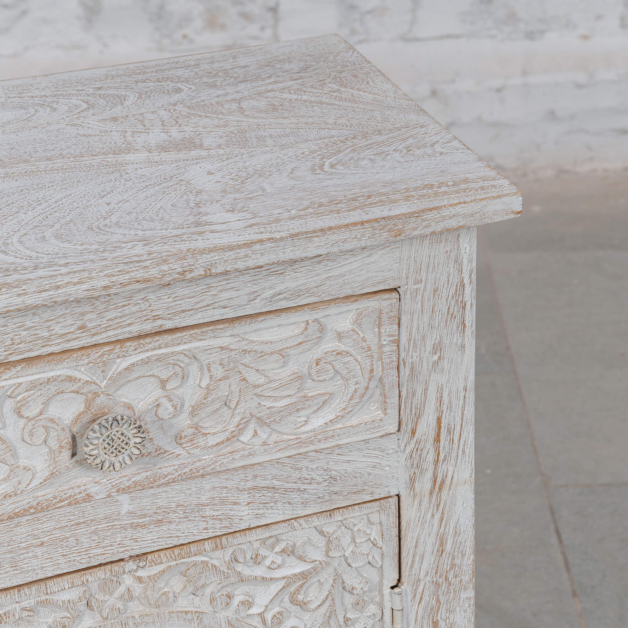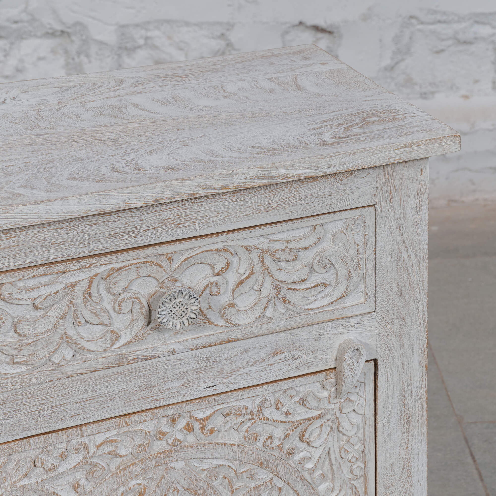 Perfect for adding a touch of elegance to your space, this cabinet is not just a storage solution but a statement piece. Its white distressed finish enhances the beauty of the carvings, making it a versatile addition to any room. Whether you’re looking to organise your bedside essentials or display decorative items, this cabinet serves multiple purposes while adding character.