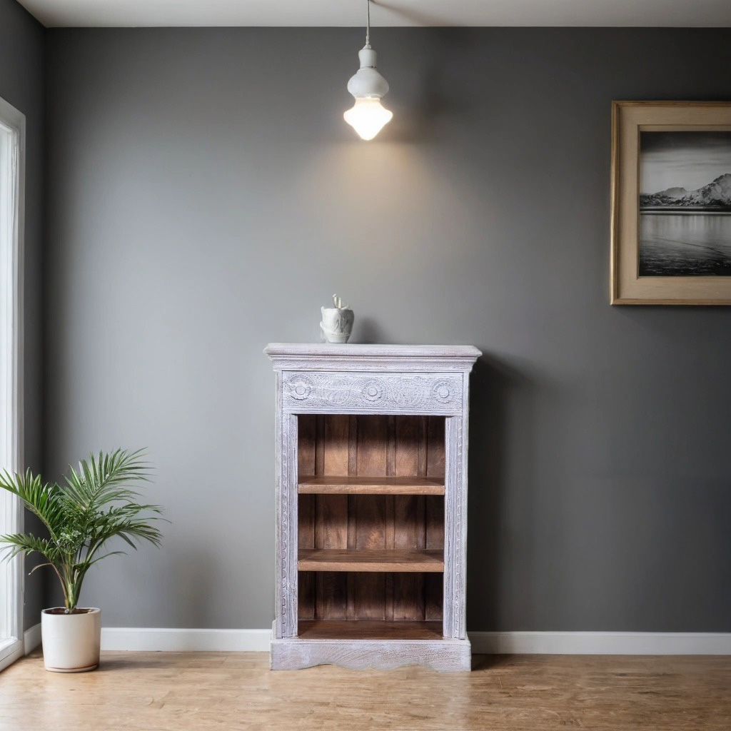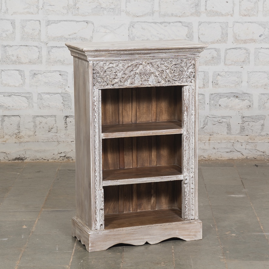 This traditional bookcase, crafted from solid mango wood, features exquisite hand-carved details and a charming distressed white finish. It’s a beautiful addition to any living space, combining timeless craftsmanship with practical storage.