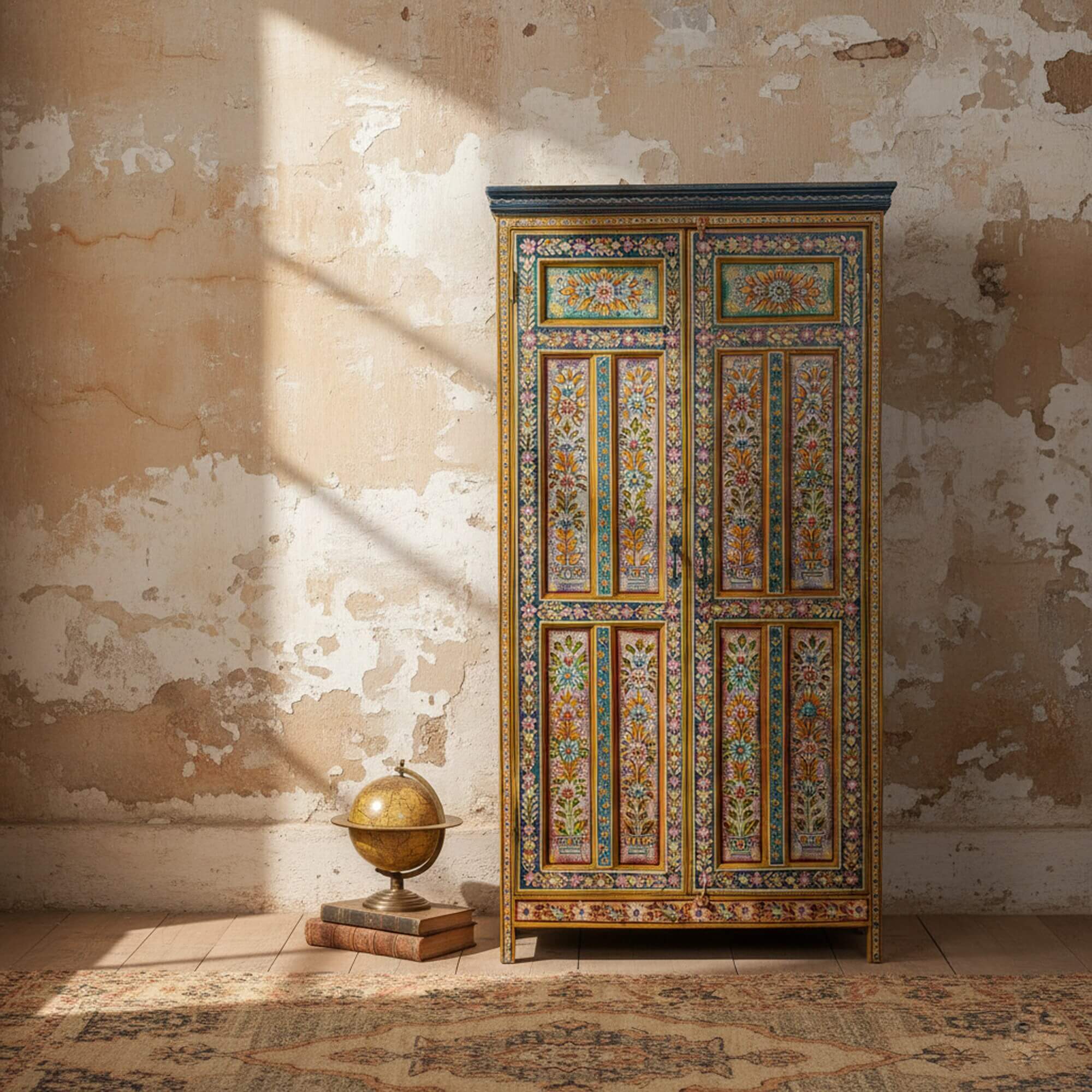 This exquisite cupboard is a true testament to Indian craftsmanship, showcasing intricate floral patterns that reflect the rich artistic heritage of Gujarat. With over six decades of history, this piece not only serves as a functional storage solution but also as a striking decorative element in your home.