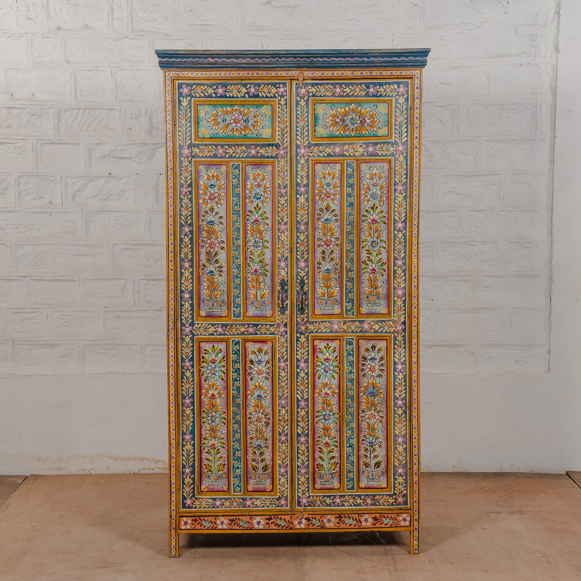 The cupboard features a vibrant array of colours, adorned with detailed flower paintings that capture the essence of traditional Indian art. The teak wood construction ensures durability while providing a warm, natural finish that complements any interior style.