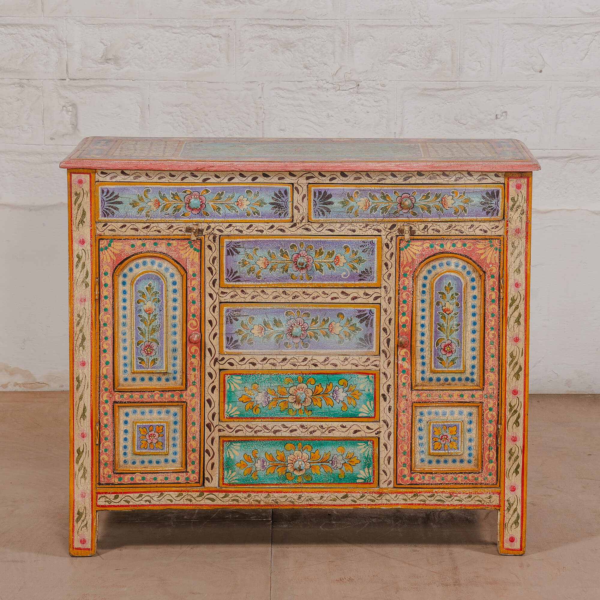 The sideboard features a beautiful array of colours, with hand-painted floral motifs adorning its surface. The intricate detailing and craftsmanship are evident in the design, showcasing an eye for aesthetics and quality. Its sturdy teak wood construction ensures durability while maintaining a classic vintage charm.