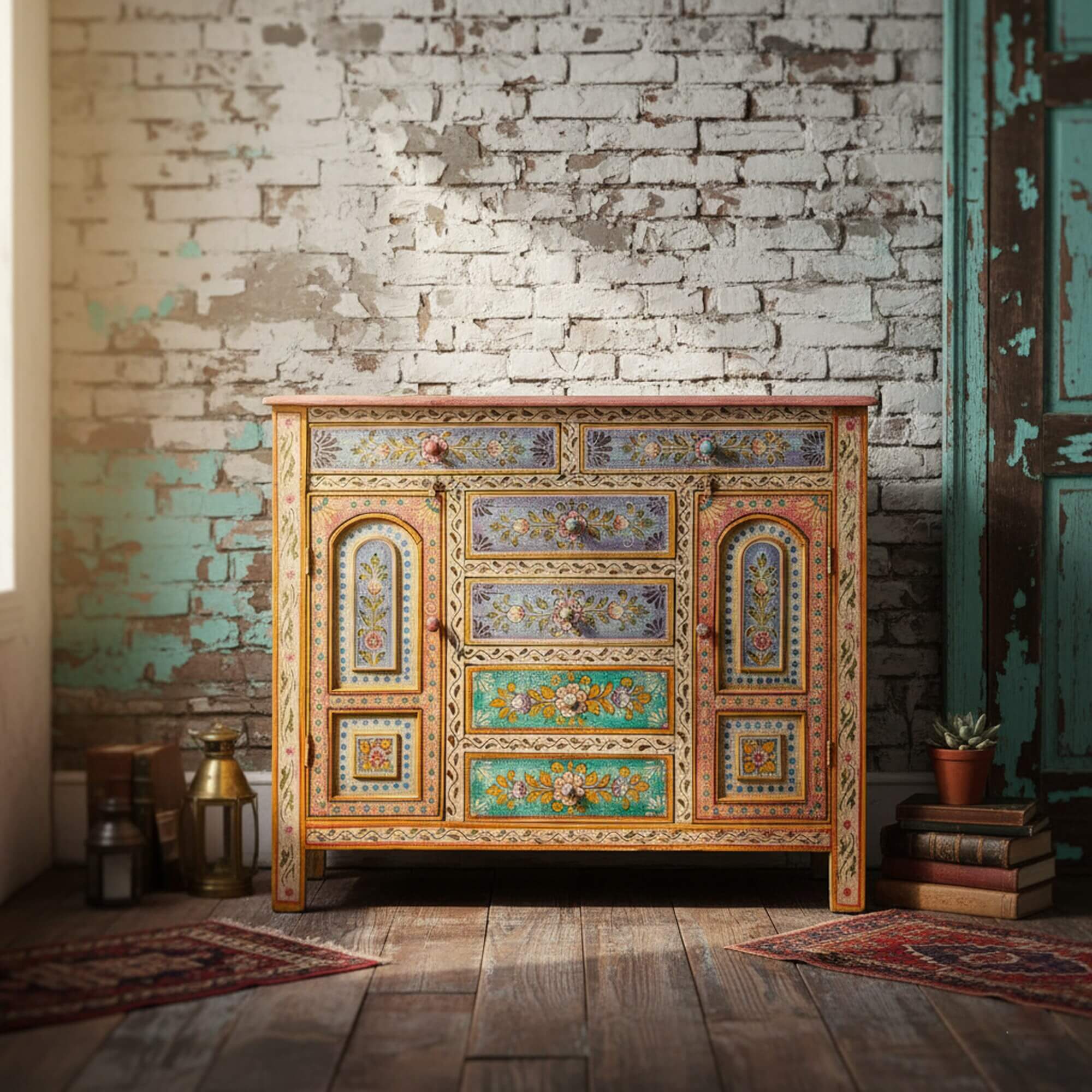 This exquisite sideboard is a true representation of Indian craftsmanship, originating from Gujarat. With over 75 years of history, it boasts hand-painted floral patterns that add a touch of elegance and colour to your living space. Perfect for those who appreciate original and vintage designs, this piece is not only functional but also a conversation starter.