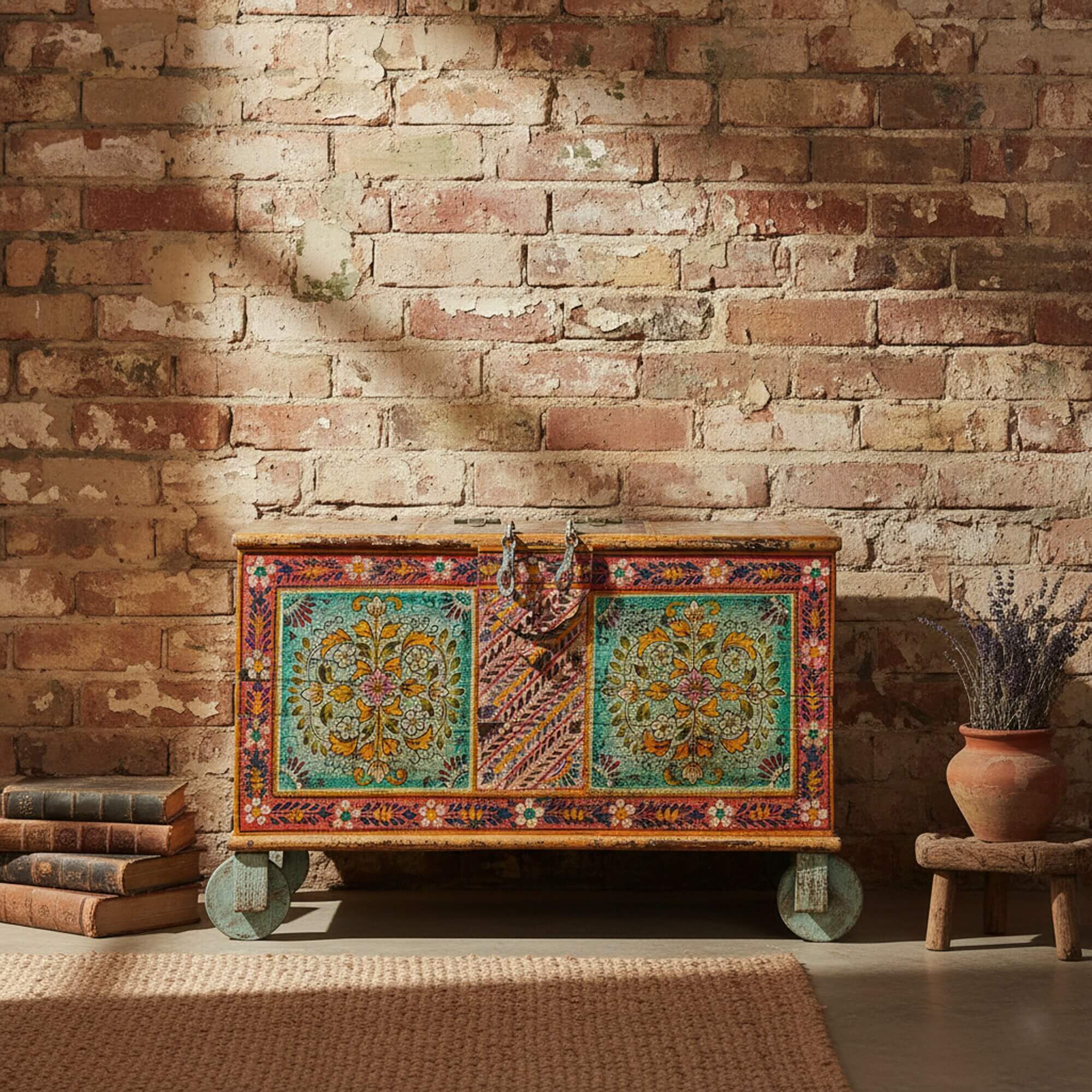 This vintage Indian chest, known as a sandook, is a testament to the rich craftsmanship of Gujarat. With a history of 70 years, it exemplifies traditional artistry and provides a glimpse into the region’s cultural heritage. The chest is adorned with intricate flower-painted designs, making it not only a functional storage solution but also a captivating decorative piece.